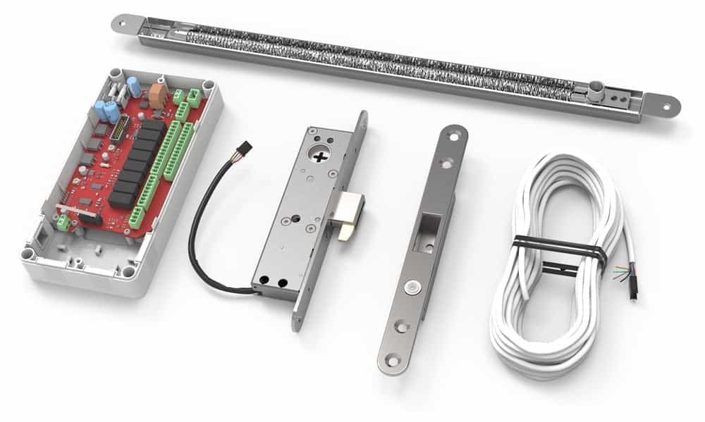 SAFETRON motorlås 5328 i sæt emballage. Sættet indeholder: motorlås 5328, styreenhed 5000, tilslutningskabel C01 (10m), endeplade 102 og rammeoverførsel CT81.