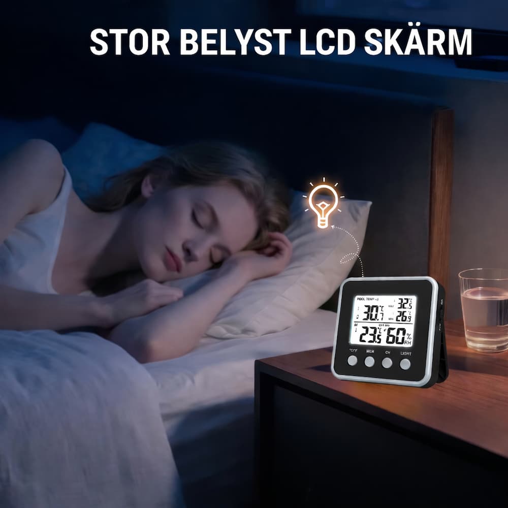 Termometern har även max- och minnesfunktion för både temperatur och luftfuktighet, så att du enkelt kan följa förändringar över tid. Med den tydliga displayen, bakgrundsbelysning i 20 sekunder och möjlighet att växla mellan °C och °F är den enkel att använda både dag och kväll.