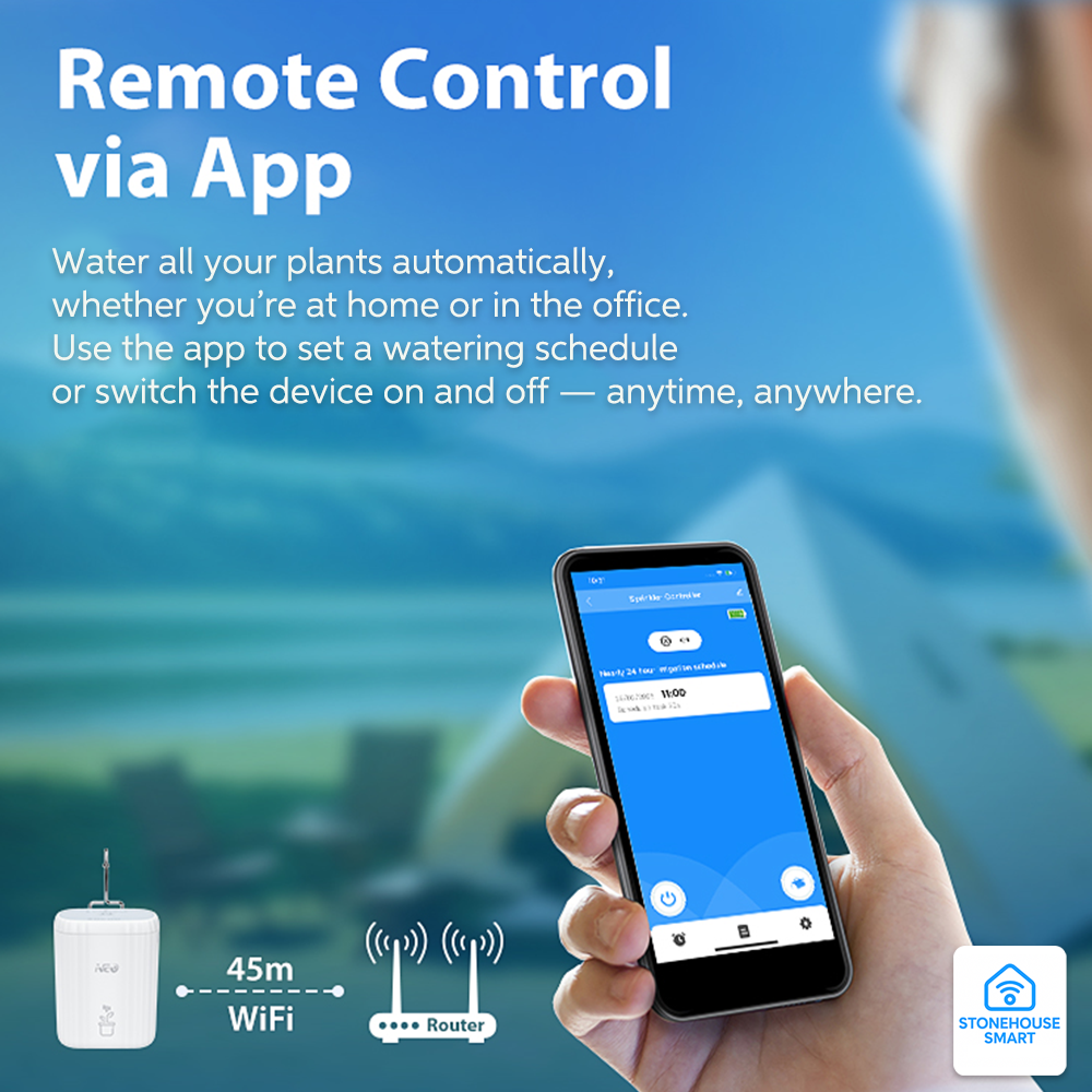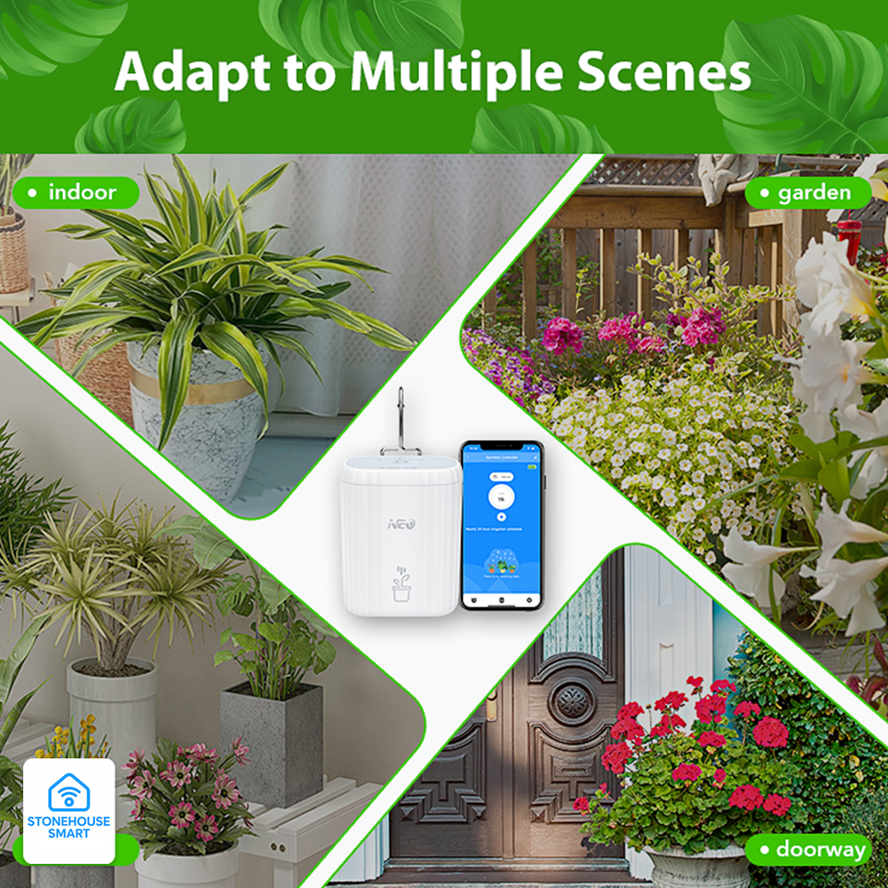 Haz que tus vacaciones estén libres de preocupaciones y evita lavarte las manos todos los días. Riego por goteo inteligente con Wi-Fi es un sistema de goteo completo y recargable que suministra a tus plantas exactamente la cantidad adecuada de agua, controlado directamente desde tu teléfono móvil.