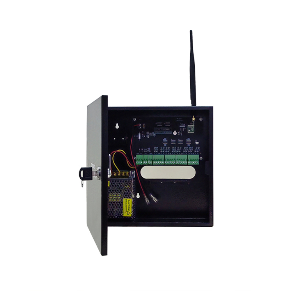 Enheten drivs via DC 15V från 220 VAC-nät (nätadapter ingår och är monterad i kapslingen) och har stöd för externt backupbatteri (12V 7Ah, tillval) för fortsatt drift vid strömavbrott. Inbyggt protection contre les manipulations et strömavbrottsindikering höjer säkerheten ytterligare.