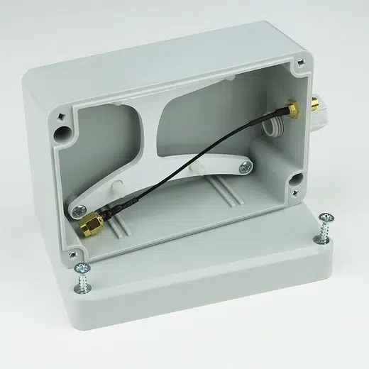 Antennkontakten är ledd till kapslingens vägg, vilket gör det möjligt att ansluta en extern SMA-antenn. Detta ger bättre mottagning och flexibel placering av antennen vid installation.